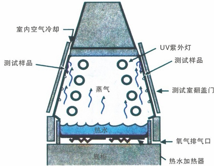 一級的光學(xué)反應(yīng)對溫度變化并不有感,然而,隨之而來的二級反應(yīng)的速度則和溫度變化緊密相關(guān)。一般,隨著溫度升高,反應(yīng)速度會加快,因此,在UV暴曬試驗過程中,溫度控制就顯得很重要,更重要的是要將加速試驗所采用的試驗溫度與材料在實際應(yīng)用中遭遇高溫度相匹配。在設(shè)備中UV過程的溫度設(shè)置為50℃~70℃中的任一點,具體取決于光照度水平和室內(nèi)環(huán)境氣溫。設(shè)備的溫度調(diào)節(jié)是通過具有微電腦演算功能的控制器來指揮設(shè)備內(nèi)的空氣加熱器、水加熱器等一系列系統(tǒng)來完成。
