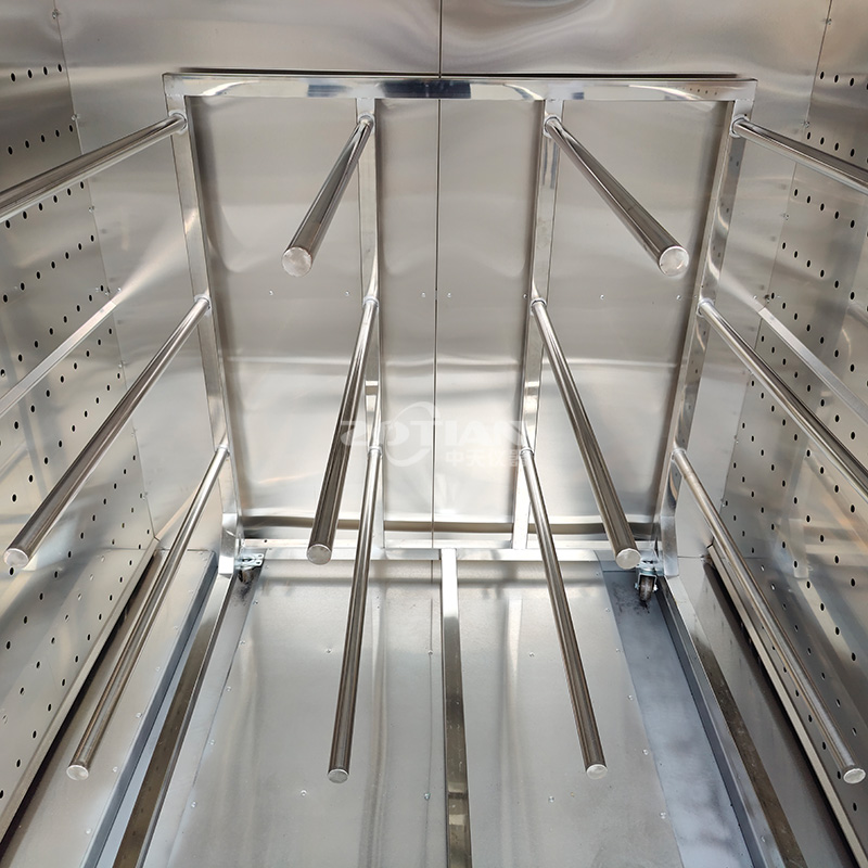 內層材質采用 1.2mm 不銹鋼板折彎焊接而成,不生銹,使爐內清潔、無塵。內部兩層隔板。內膽尺寸:寬 1400mm,深 600mm,高 1200mm,內膽四周鋪 100mm 厚高溫硅酸鋁隔熱棉,門邊四周增加耐高溫密封硅膠條,使爐外溫度不燙手。